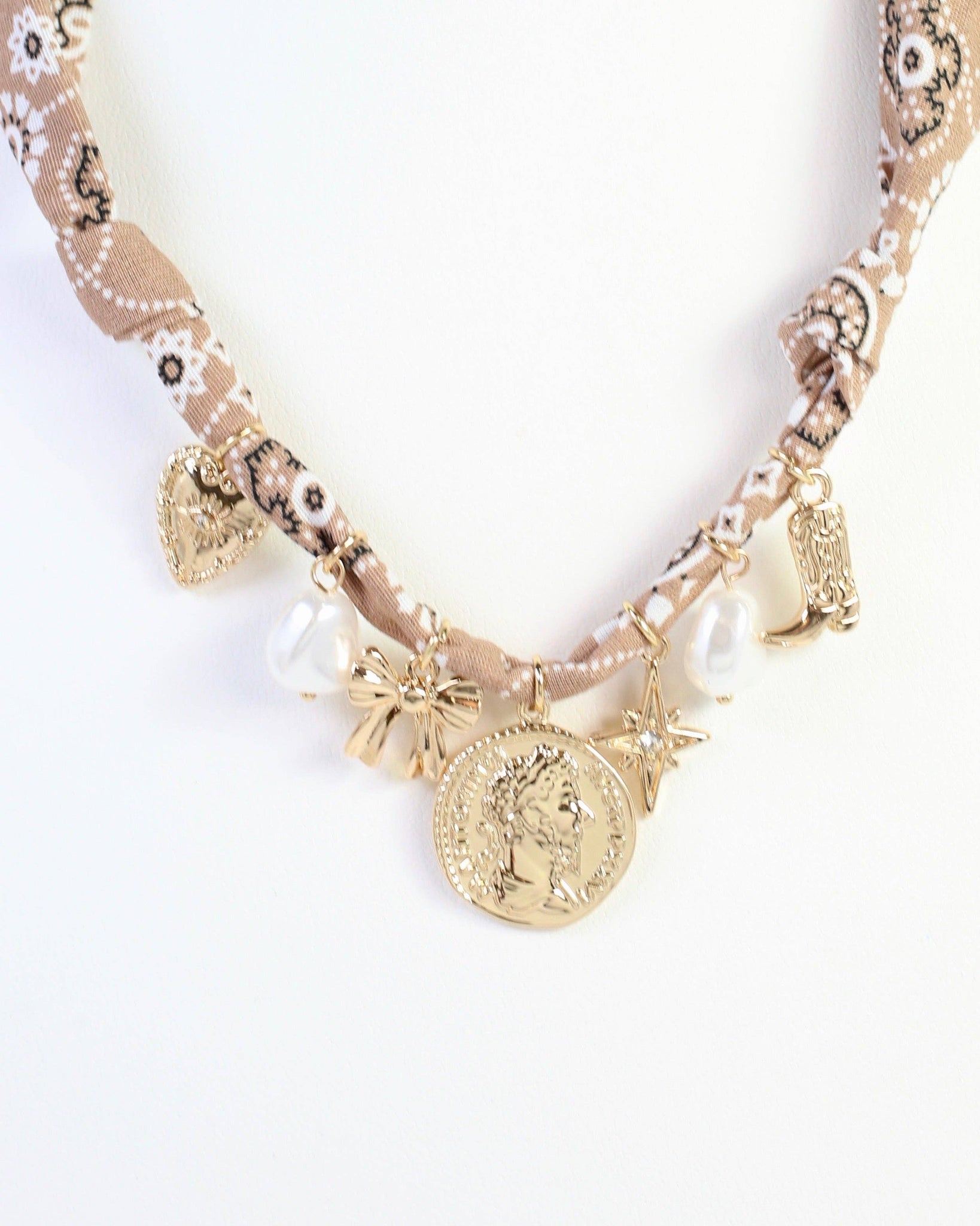 Get a playful western twist with the Amy Scarf Charm Necklace in Khaki. This bandana-style scarf is knotted and features seven charming accents—boot, coin, pearls, star, bow, and heart—creating a sweet and stylish way to embrace that western vibe with a fun flair.