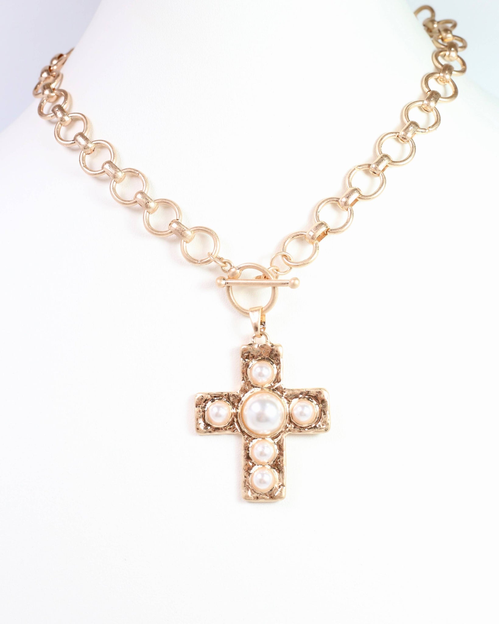 Add a touch of charm with the Clampett Cross Necklace in Gold. Featuring a worn gold finish, a toggle accent, and a cross pendant adorned with large pearls, this necklace brings playful elegance to any outfit. The back clasp and extender ensure you can wear it just the way you like, making it a versatile favorite for day or night.