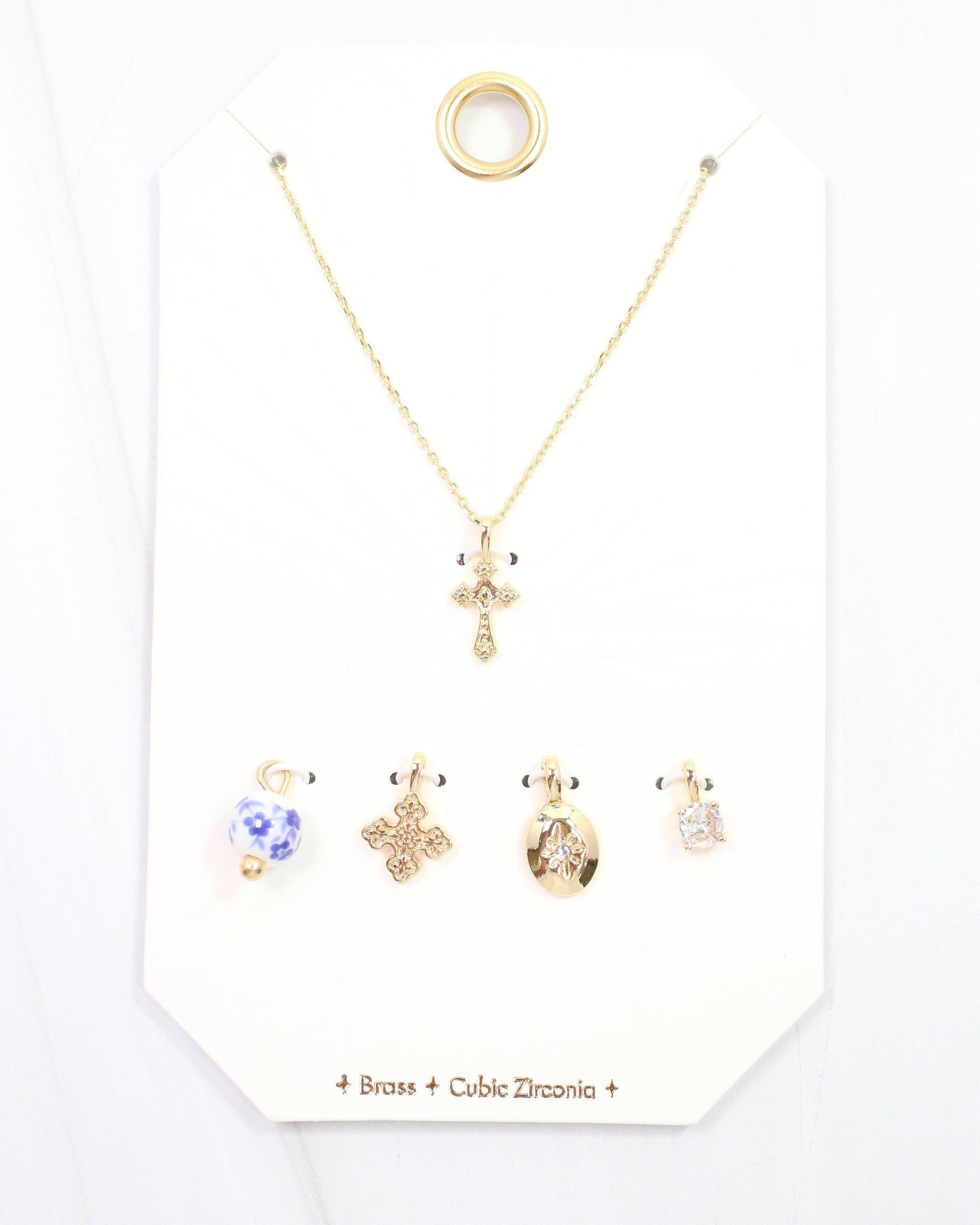 Add a splash of charm to your look with this playful Crossing Blue Jordan Necklace Set. Featuring five unique charms—including a blue and white bead, two crosses, an oval with a starburst, and a sparkling solitaire—this gold-tone brass necklace sparkles with CZ accents. Perfect for layering or wearing solo, it brings a fun, vibrant touch to any outfit.