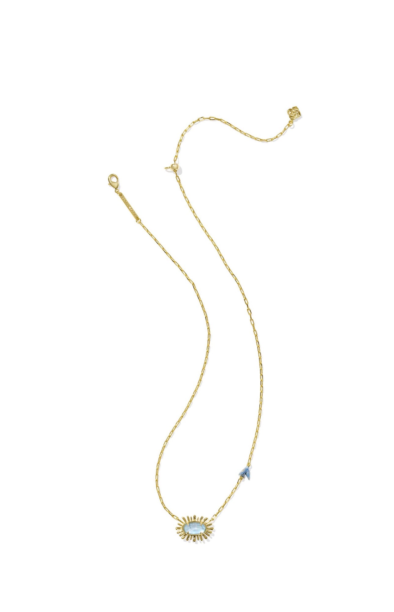 Everyone’s favorite necklace meets some of our favorite spring design motifs! The Elisa Bird Gold Short Pendant Necklace in Sky Blue Mother of Pearl features our bestselling Elisa silhouette, surrounded by a beautiful metal sunburst frame, and finished with a dainty bird detail on the chain. Brighter days are on the horizon when you rock this style.