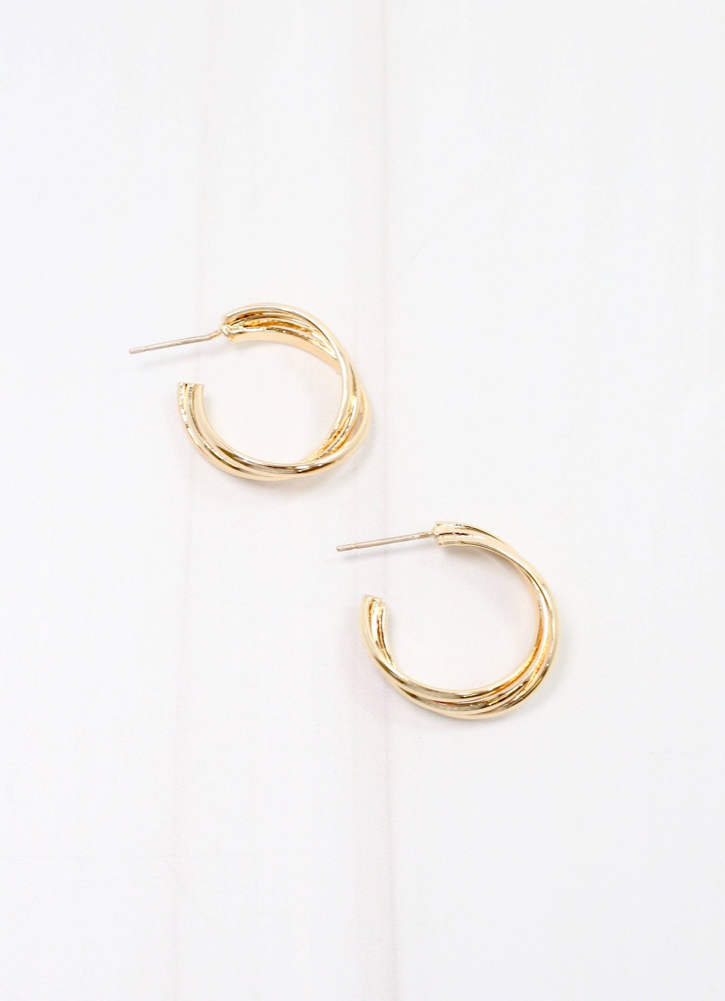 This triple row hoop earring has a twisted design on a post back. It has an elegant look that never goes out of style. Dimensions: * 0.9" diameter * 18K gold dipped * Sterling silver post
