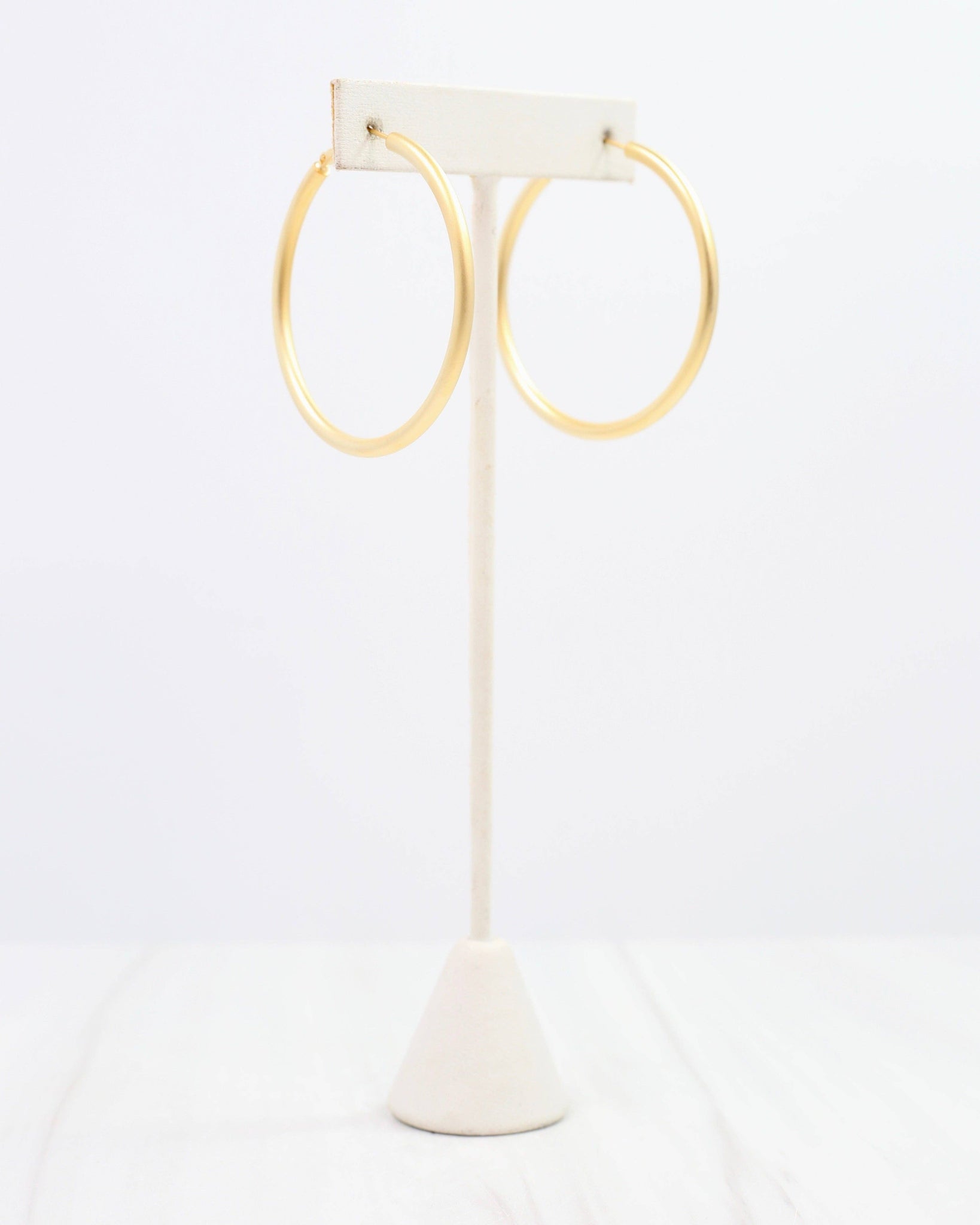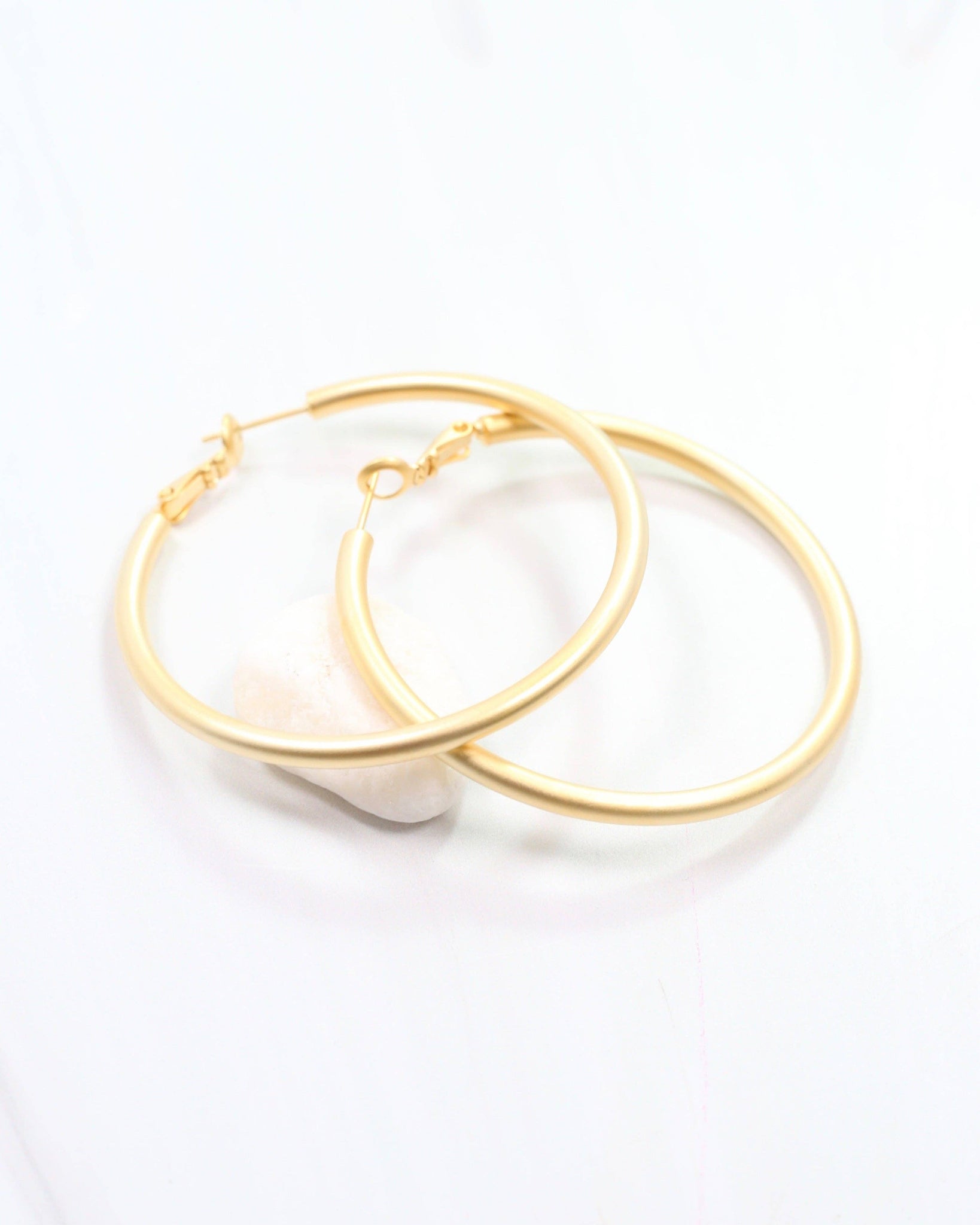 This fabulous hoop has a Matte Gold finish and a latchback closure. It's just the right size to wear everyday for daytime outings or elegant events. Dimensions: * 1.9" diameter * Brass * Gold dipped