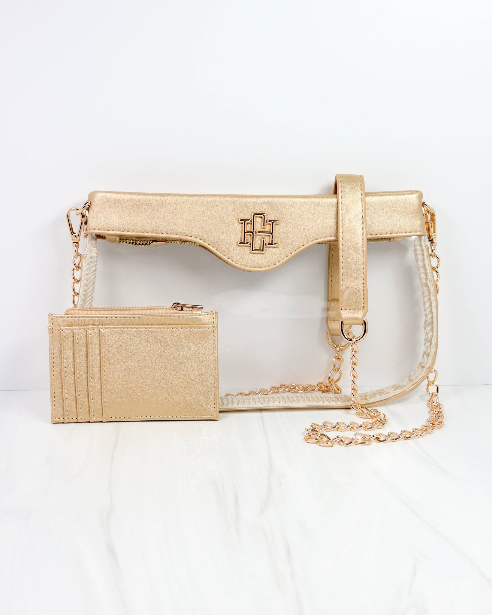 The Madi Clear Crossbody in Gold is the perfect accessory for game day, combining style and practicality. Its transparent design meets stadium requirements, while the chic chain strap adds a fashionable touch. Easily pair it with our purse chains, nylon strap, or Molly Card Holder to customize your look and keep essentials close at hand.