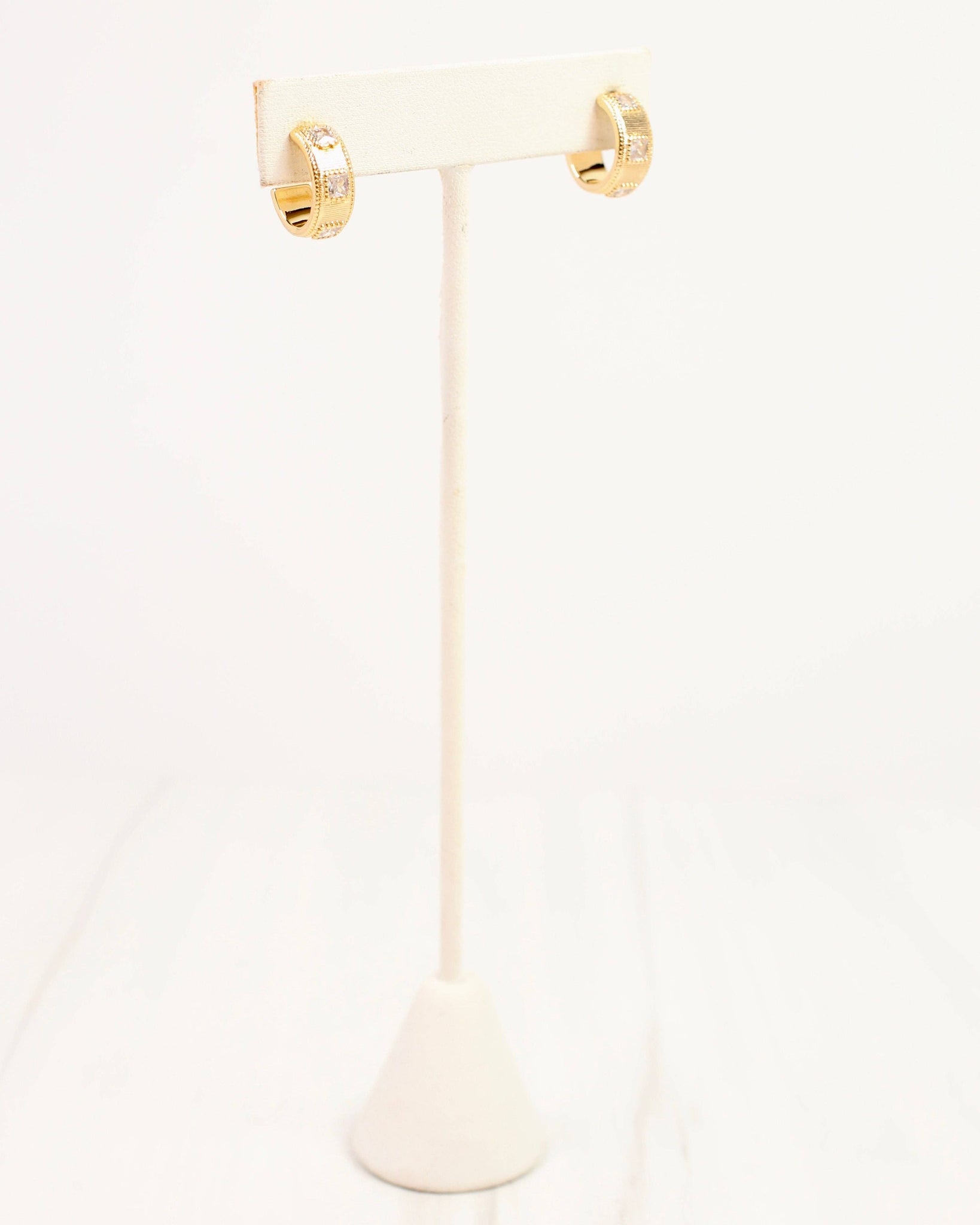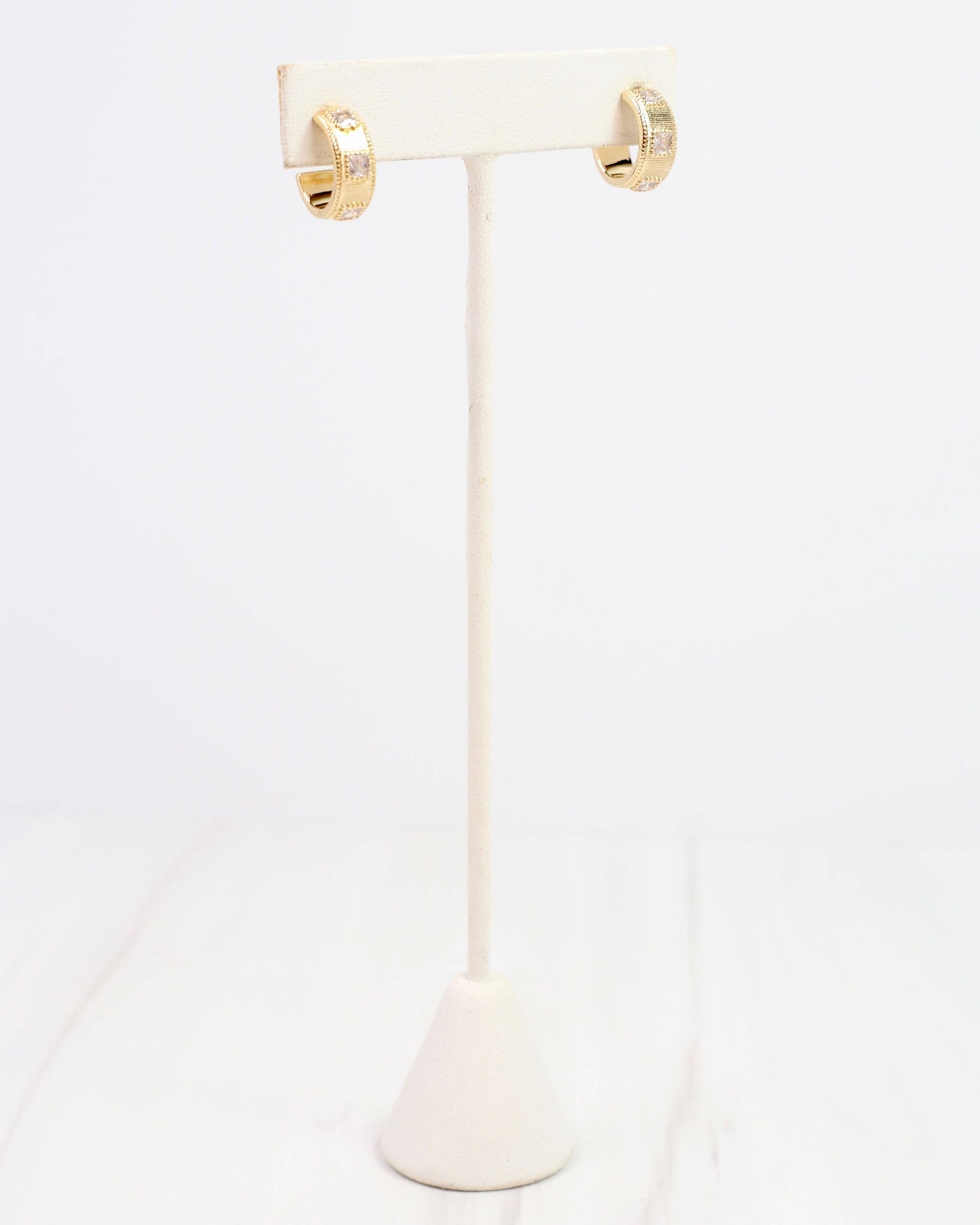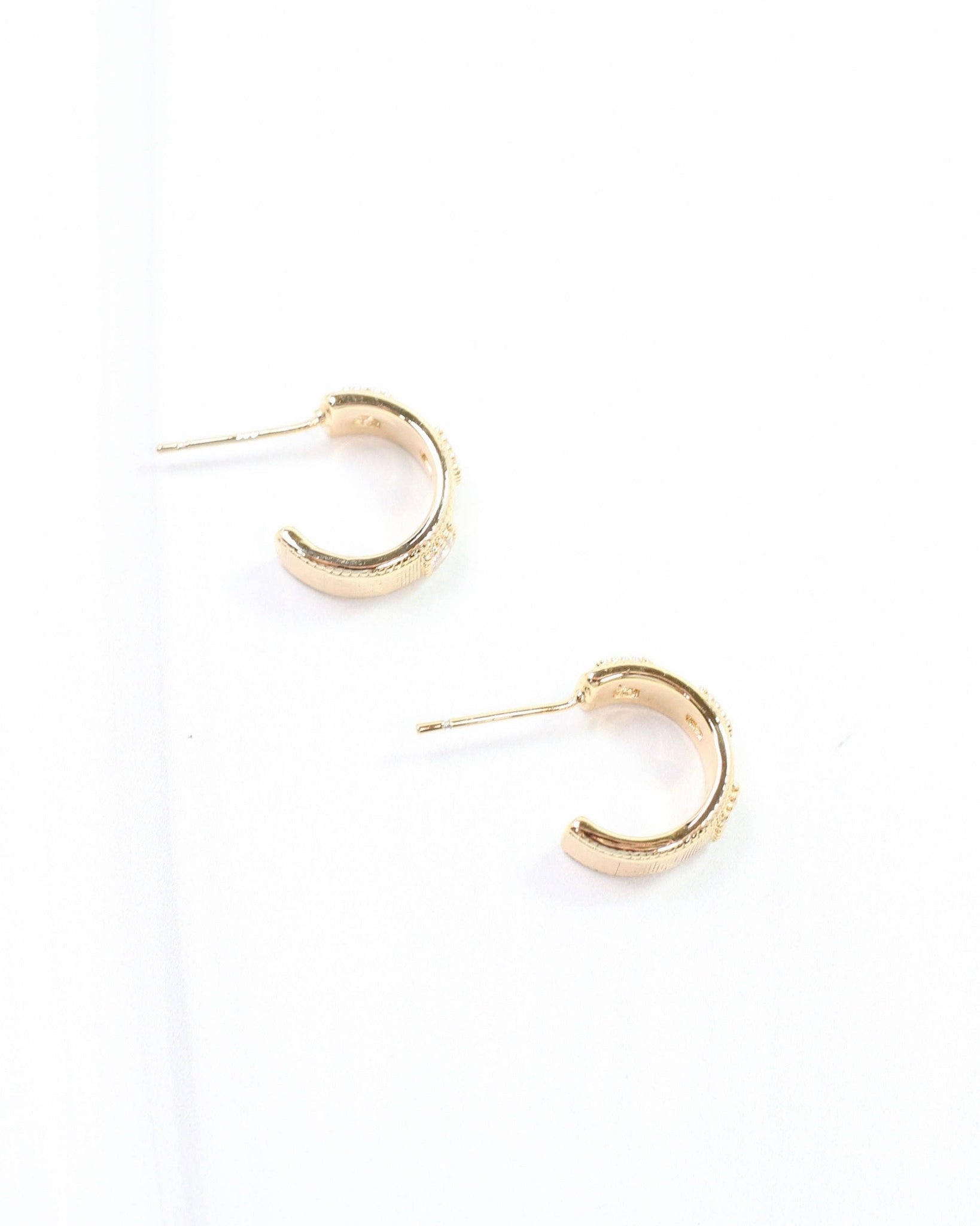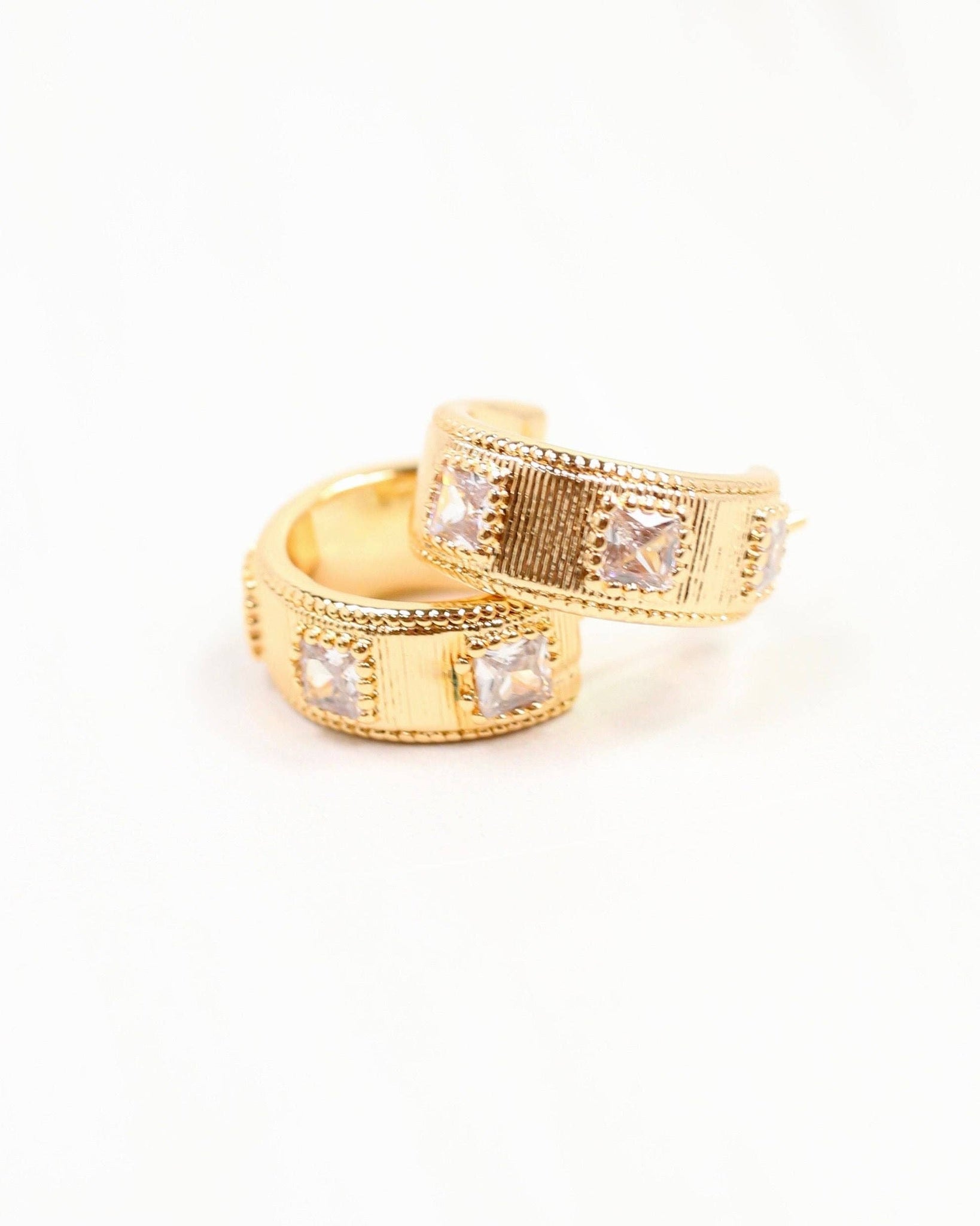 Add a touch of sparkle to your look with the Serrano CZ Hoop Earrings in Gold. Featuring a playful ribbed texture and shimmering gold CZ squares, these gold-dipped hoops bring fun and flair to any outfit. Perfect for adding a little extra shine to your day!